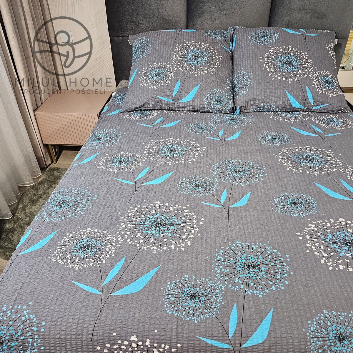 - Kolor: Ciemnoszara pościel z eleganckimi, błękitnymi detalami, tworząca relaksującą atmosferę.