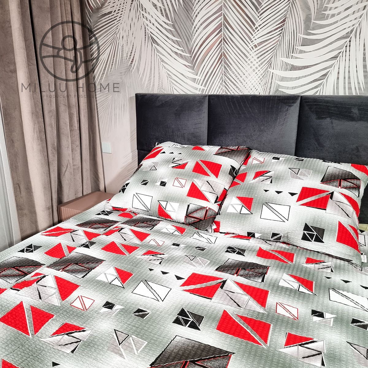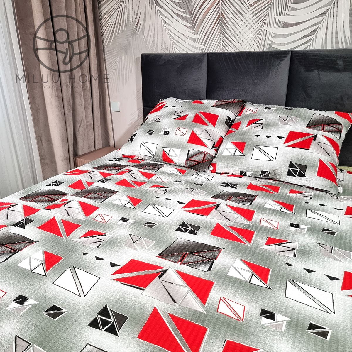 - Wzór: Geometria w odcieniach czerwieni, szarości i czerni – Nadaje wyrazistości i nowoczesnego charakteru sypialni.