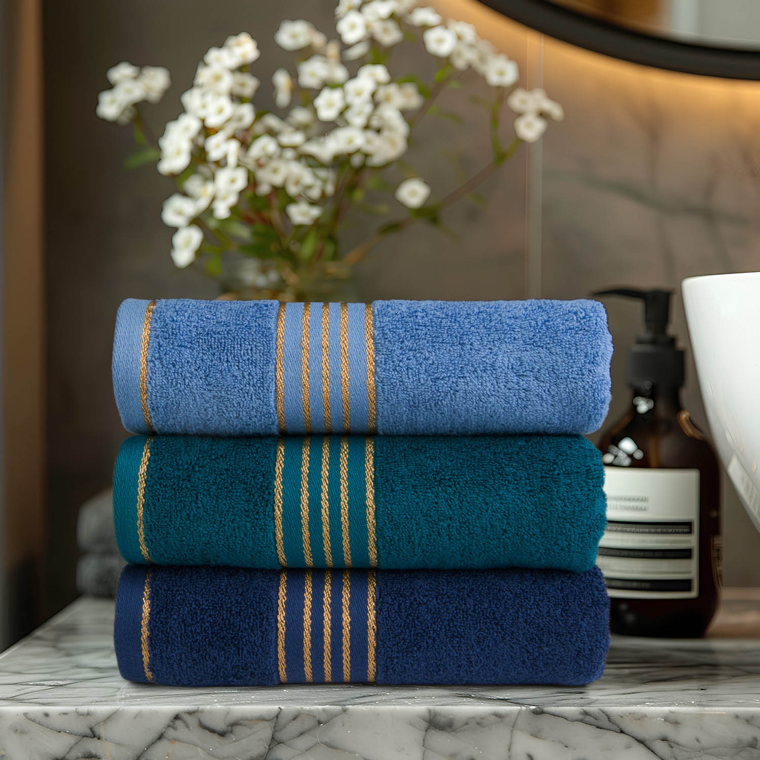 3-częściowy komplet ręczników TIWANO w pudełku. To wysokiej jakości ręczniki wykonane z miękkiej 100% bawełny. Odznaczają się wyjątkową miękkością i doskonałą absorpcją wody. Ich klasyczny design wzbogacony został o subtelną bordiurę w postaci, złotych nici która nadaje całości wyrafinowanego charakteru. Są przyjemne w dotyku – idealne na prezent lub do codziennego użytku z nutą luksusu.