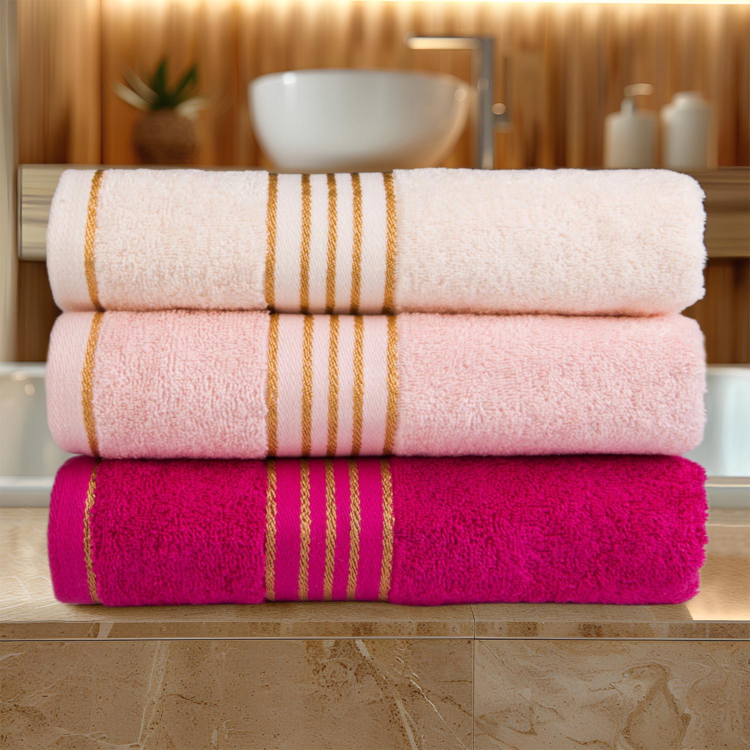3-częściowy komplet ręczników TIWANO w pudełku. To wysokiej jakości ręczniki wykonane z miękkiej 100% bawełny. Odznaczają się wyjątkową miękkością i doskonałą absorpcją wody. Ich klasyczny design wzbogacony został o subtelną bordiurę w postaci, złotych nici która nadaje całości wyrafinowanego charakteru. Są przyjemne w dotyku – idealne na prezent lub do codziennego użytku z nutą luksusu.